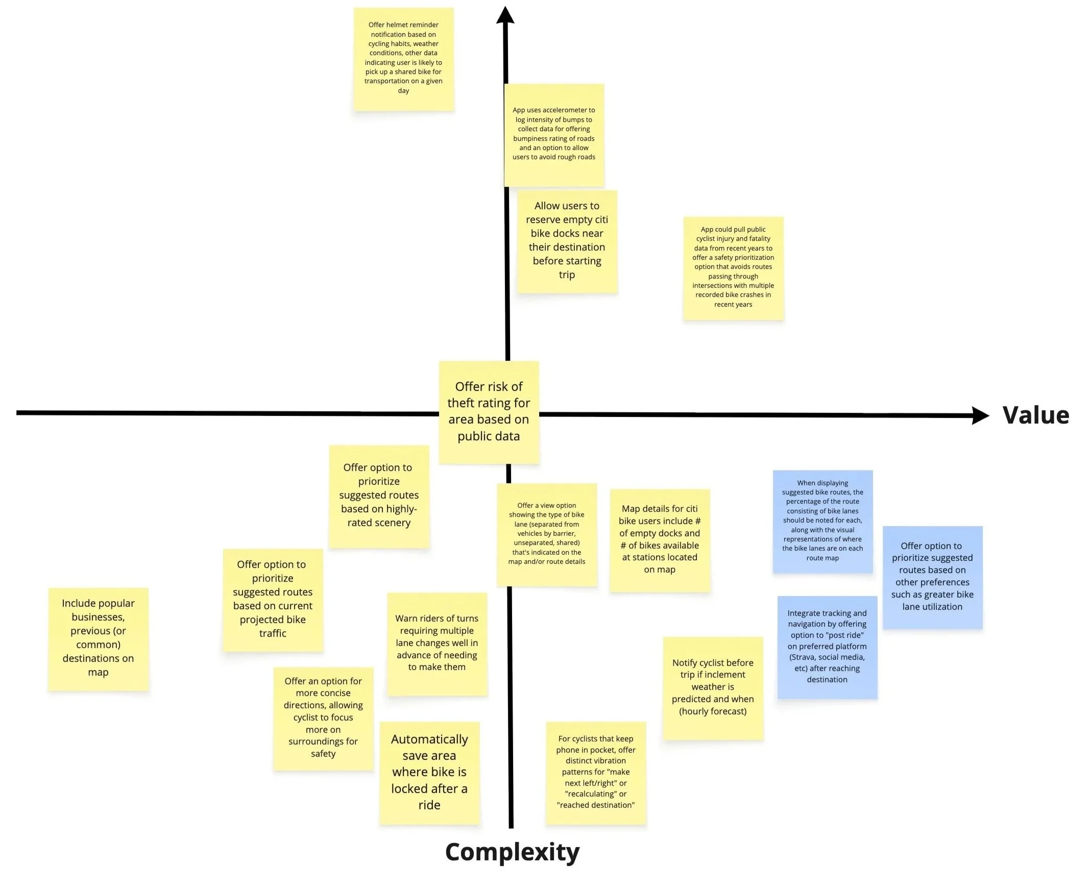 I brainstormed solutions and came up with 18 opportunities for entirely new app features or enhanced features from existing apps that would address the issues cyclists identified. I then arranged the potential solutions in a value vs. complexity quadrant to visualize which features had the best balance of lower complexity for developers and highest value for users. This allowed me to limit the scope of the project to solutions that had the highest potential return on investment.