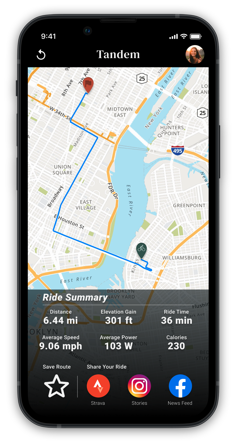 Integrate tracking and navigation by offering option to post rides on user’s preferred platform (Strava, social media, etc) after reaching destination.