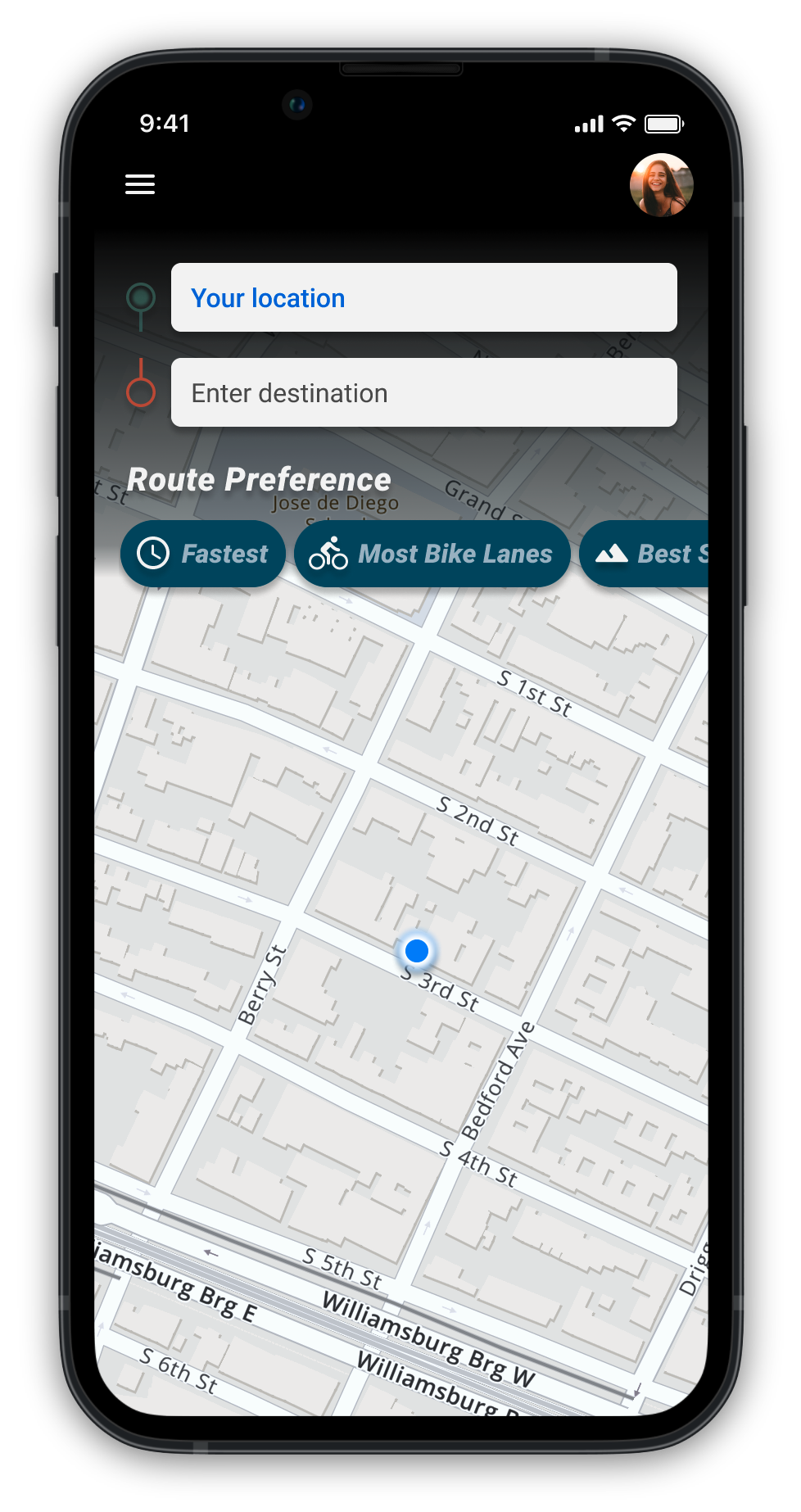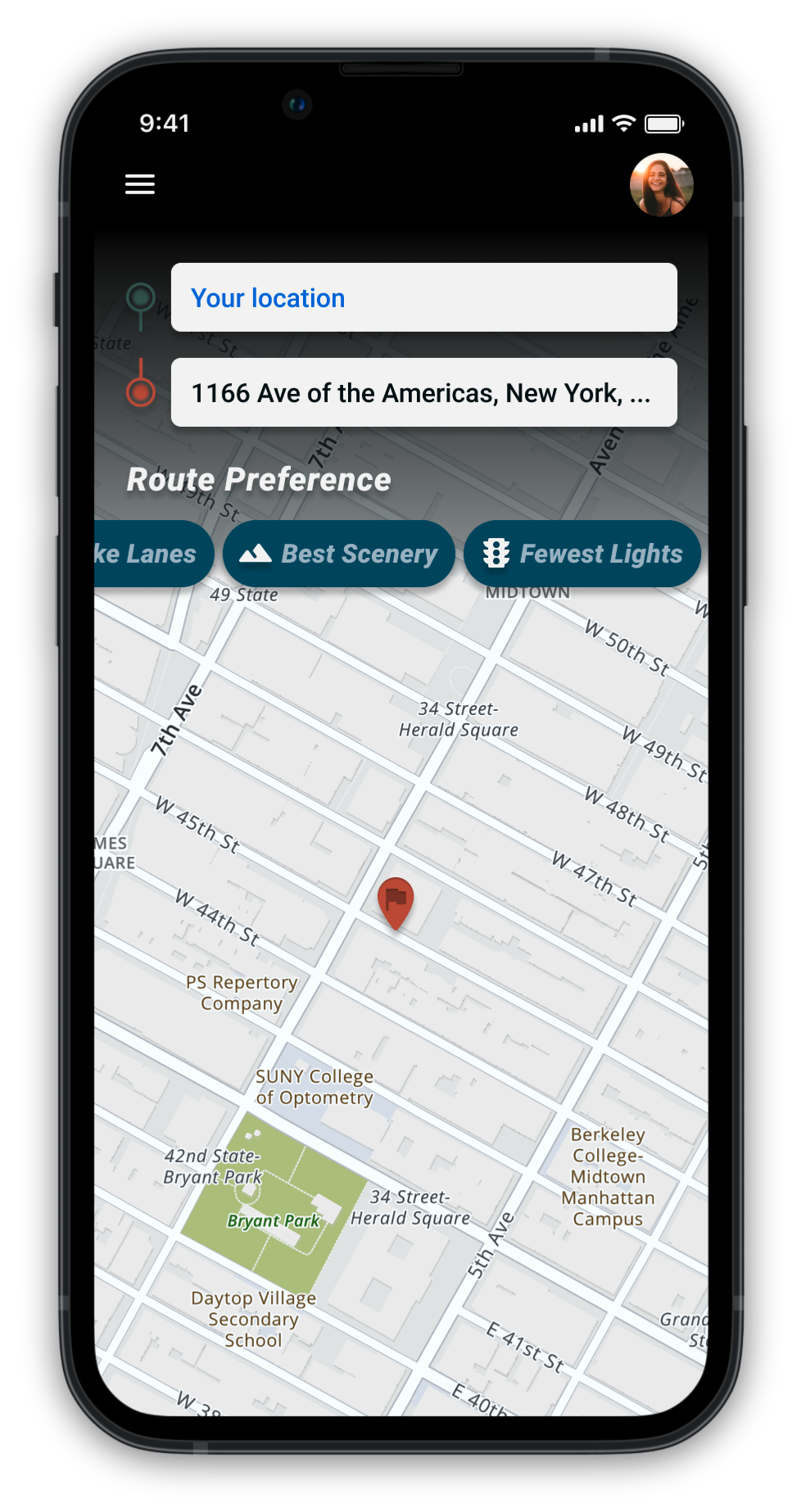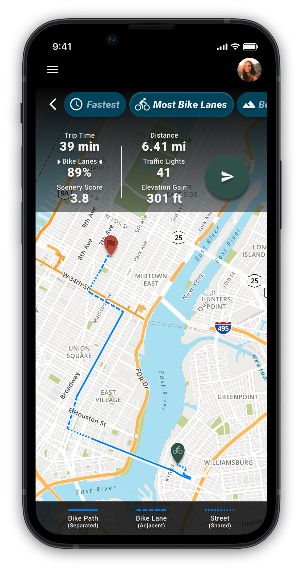 “I try to remember where the bike lanes are on the map before pressing for route guidance, so once I press it, I can pick the route that uses the most.