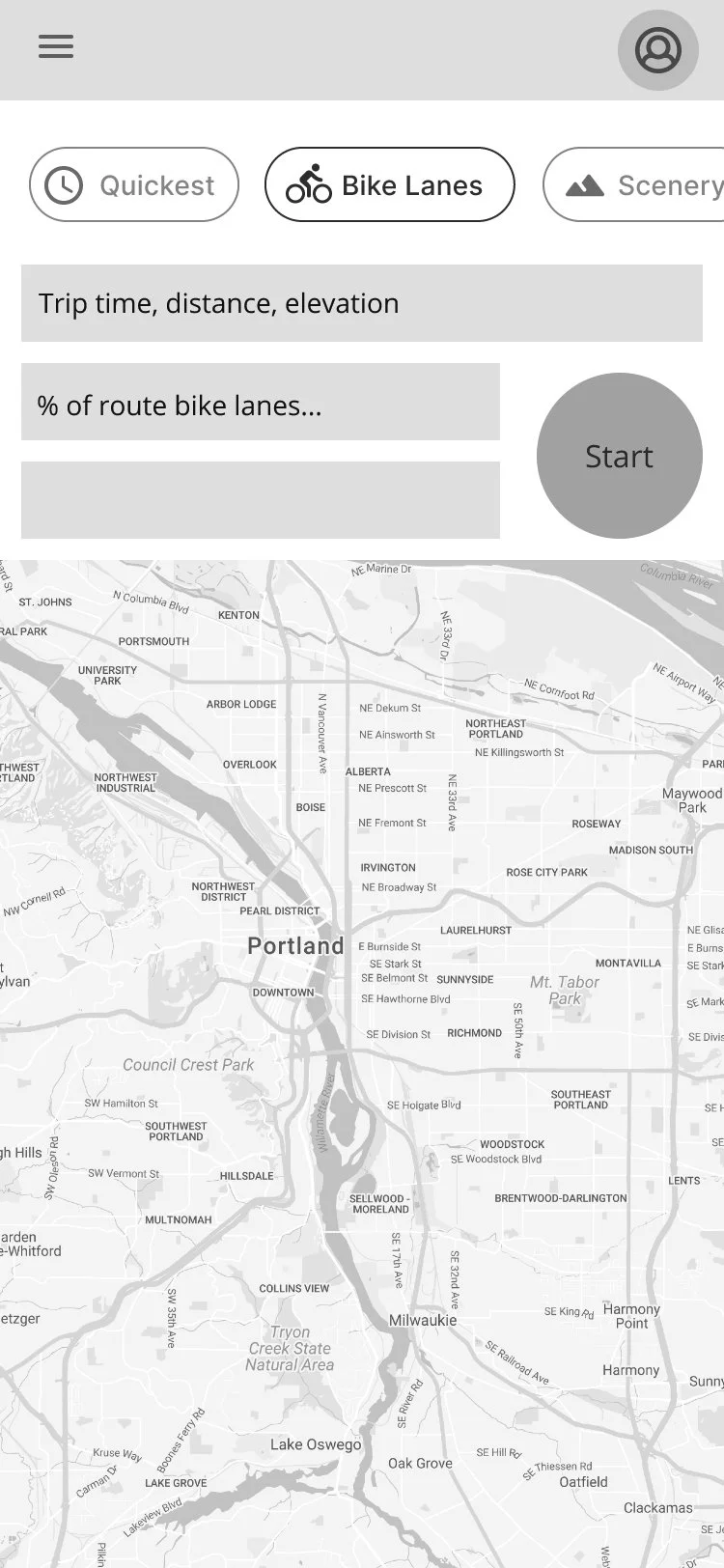 When the shortest trip time isn't their top priority, users can choose from three other prioritization options. I chose the three additional route characteristics rated a 7 out of 10 or higher in importance by a majority of survey respondents to offer as options users can prioritize for their bike route.