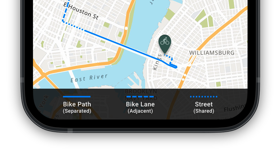 It seemed to me this had the added benefit of visually conveying the level of ease or "flow" cyclists could expect on each segment of the route. A solid line indicates uninterrupted "smooth sailing" with presumably only other cyclists to navigate around, a dashed line indicating more potential for obstacles like parked delivery vans impeding the cyclist's way through, and a dotted line being the most chaotic route line where potential obstacles in the way of cyclists abound (namely, vehicle traffic).